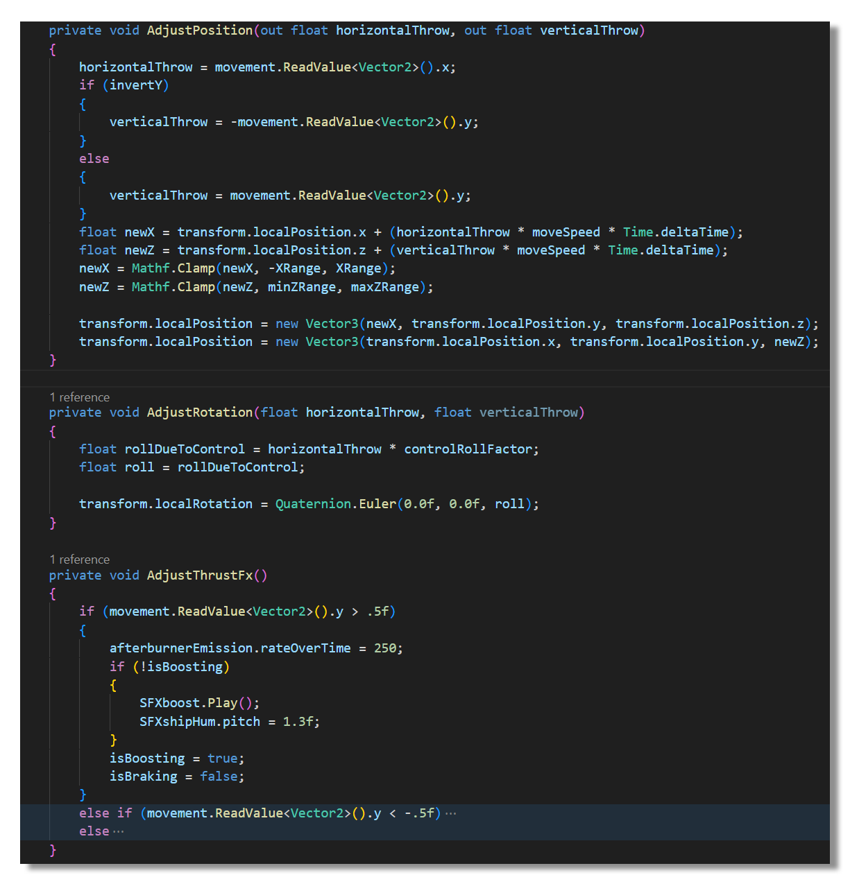 Movement needed to feel fast, responsive, and fun. Multiplying the analog stick input values by the move speed allows the ship to move 1:1 with the stick movement. Additionally, the ship will roll to the left and right, depending on how hard the player is evading, and will engage boosters or brakes, if the player is fully throttling forward or pulling back on the stick. Though these are just visual and audio embellishments to the ship movement, they do enhance and help illustrate the control that the player has of their ship.